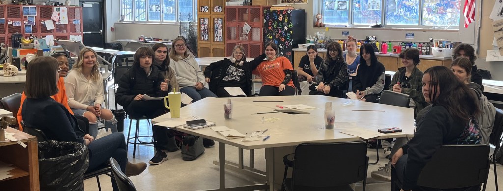 Anyway, we open the door. The room looks like a bomb went off in it. Granted it is an art room and they should look like a bomb went off in it, but there was no sense of order for a group of listeners to sit and feel welcomed. I mean I didn’t feel welcomed the moment I walked through the door. I asked the teacher, who I know, and who I think is extremely lazy, about the room set-up. He shrugged his shoulders and said he didn’t know what was going on. My response was, “Brilliant!” I did not hold back that I was not exactly pleased with his lazy nonchalant response. So, I do what I do, and began taking chairs off tables that were scattered around the room and made a circle.